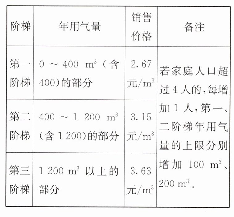 (1)一户家庭人口为 3 人,年用气量为 $ 200 \, m^3 $,则该年此户需缴纳气费