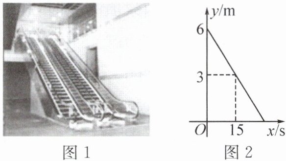 4. (应用意识、模型观念)如图1,某商场在一楼到二楼之间设有上、下行自动扶梯和步行楼梯。甲、乙两人从二楼同时下行,甲乘自动扶梯,乙走步行楼梯,甲离一楼地面的高度$h$(单位:$m$)与下行时间$x$(单位:$s$)之间具有函数关系$h = - \frac{3}{10}x + 6$,乙离一楼地面的高度$y$(单位:$m$)关于下行时间$x$(单位:$s$)的函数关系如图2所示。