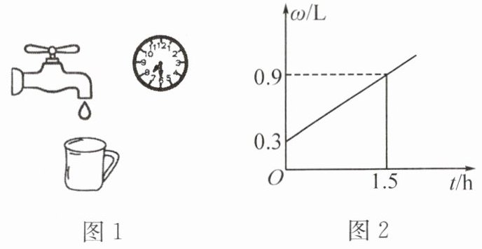 3. 水龙头关闭不严会造成漏水,用可以显示水量的容器做如图1的实验,并根据实验数据绘制出容器内盛水量$w$(单位:$L$)与漏水时间$t$(单位:$h$)的函数关系图象(如图2),结合图象解答下列问题。