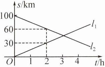 2. 已知A,B两地相距100km,甲、乙两人骑车同时分别从A,B两地出发相向而行。假设他们都保持匀速行驶,则他们各自到A地的路程$s$(单位:km)都是骑车时间$t$(单位:h)的一次函数。如图,直线$l_{1}$,$l_{2}$分别表示甲、乙骑车时$s$与$t$之间关系的图象,结合图象提供的信息,经过