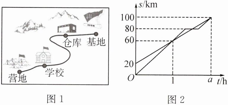 4. (应用意识、模型观念)[2023·宁波]某校与部队联合开展红色之旅研学活动,上午7:00,部队官兵乘坐军车从营地出发,同时学校师生乘坐大巴从学校出发,沿公路(如图1)到爱国主义教育基地进行研学。上午8:00,军车在离营地60km的地方追上大巴并继续前行,到达仓库后,部队官兵下车领取研学物资,然后乘坐军车按原速前行,最后和师生同时到达基地,军车和大巴离营地的路程$s$(单位:km)与所用时间$t$(单位:h)的函数关系如图2所示。