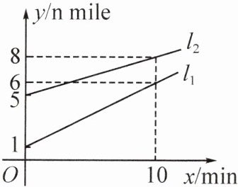 3. [2024·浑南区期末]某边防局接到情报,近海处有一可疑船只A正向公海方向行驶,边防局迅速派出快艇B追赶。下图中$l_{1}$,$l_{2}$分别表示两船相对于海岸的距离$y$(单位:n mile)与追赶时间$x$(单位:min)之间的关系。