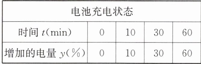 实验一:探究电池充电状态下新能源汽车仪表盘增加的电量 $ y(\%) $ 与时间 $ t(\min) $ 的关系。
