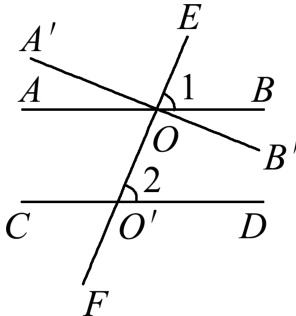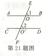 21.如图,直线$AB// CD$,直线$EF$分别与$AB$,$CD$交于点$O$,$O'$.请用反证法证明:$\angle1 = \angle2$.