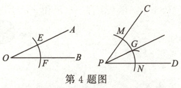 4. 如图,已知$\angle AOB = 25^{\circ}$,$\angle CPD = 55^{\circ}$,分别以$O$,$P$为圆心,以同样长为半径作弧,交$OA$,$OB$于点$E$,$F$,交$PC$,$PD$于点$M$,$N$;以点$N$为圆心,以$EF$的长为半径作弧,交弧$MN$于点$G$,作射线$PG$,则$\angle CPG$的度数是(