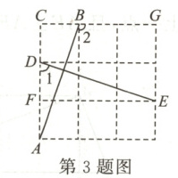 3. 如图,在$3 × 3$的正方形方格中,每个小正方形的边长都是$1$. 已知$\triangle ABC \cong \triangle EDF$,则$\angle 1$和$\angle 2$的关系是(