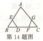 14. 工人师傅要检查“人”字梁的$\angle B$和$\angle C$是否相等,但他手边没有量角器,只有一个刻度尺. 他是这样操作的:①分别在$BA$和$CA$上取$BE = CG$;②在$BC$上取$BD = CF$;③量出$DE$的长$a$米,$FG$的长$b$米. 如果$a = b$,则说明$\angle B$和$\angle C$是相等的. 他的这种做法合理吗?为什么?