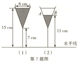 7.图(1)是装了液体的高脚杯示意图(数据如图),用去一部分液体后如图(2)所示,此时液面$AB =$ (