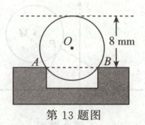 13. 工程上常用钢珠来测量零件上小圆孔的宽口,假设钢珠的直径是$10 mm$,测得钢珠顶端离零件表面的距离为$8 mm$,如图所示,则这个小圆孔的宽口$AB$的长度为