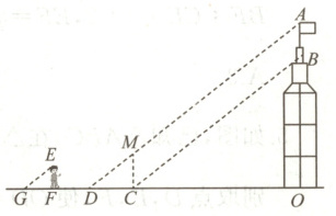 例题2 小明和小华利用阳光下的影子来测量一建筑物顶部旗杆的高。如图所示,在某一时刻,他们在阳光下,分别测得该建筑物$OB$的影长$OC$为$16$米,$OA$的影长$OD$为$20$米,小明的影长$FG$为$2.4$米,其中$O$,$C$,$D$,$F$,$G$五点在同一直线上,$A$,$B$,$O$三点在同一直线上,且$AO \perp OD$,$EF \perp FG$。已知小明的身高$EF$为$1.8$米,求旗杆的高$AB$。