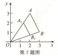 7. 在平面直角坐标系中,将$\triangle AOB$以点$O$为位似中心,$\frac{2}{3}$为位似比作位似变换,得到$\triangle A_1OB_1$。已知$A(2,3)$,则点$A_1$的坐标是