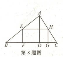 8. 如图,在$\triangle ABC$中,点$F$,$G$在$BC$上,点$E$,$H$分别在$AB$,$AC$上,四边形$EFGH$是矩形,$EH = 2EF$,$AD$是$\triangle ABC$的高,$BC = 8$,$AD = 6$,那么$EH$的长为