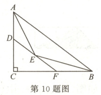10. 如图,在$Rt\triangle ABC$中,$\angle C = 90^{\circ}$,$AC = 3$,$BC = 4$,点$D$是$AC$边上的一点,过点$D$作$DF // AB$,交$BC$于点$F$,作$\angle BAC$的平分线交$DF$于点$E$,连接$BE$。若$\triangle ABE$的面积是$2$,则$\frac{DE}{EF}$的值是