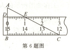 6. 如图,在$\triangle ABC$中,$\angle ABC = 90^{\circ}$,$\angle A = 60^{\circ}$,直尺的一边与$BC$重合,另一边分别交$AB$,$AC$于点$D$,$E$。点$B$,$C$,$D$,$E$处的读数分别为$15$,$12$,$0$,$1$,则直尺宽$BD$的长为