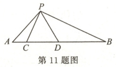 11. 如图,点$C$,$D$在线段$AB$上,$\triangle PCD$是等边三角形,且$\triangle ACP \backsim \triangle PDB$,求$\angle APB$的度数。