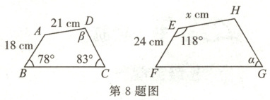 8. 如图,四边形 $ABCD \sim$ 四边形 $EFGH$,求 $\angle \alpha$,$\angle \beta$ 的大小和 $EH$ 的长度.