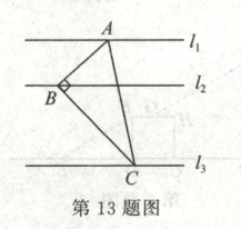 13.如图,在$\bigtriangleup ABC$中,$\angle BAC = 60^{\circ}$,$\angle ABC = 90^{\circ}$,直线$l_{1} // l_{2} // l_{3}$,$l_{1}$与$l_{2}$之间距离是$1$,$l_{2}$与$l_{3}$之间距离是$2$,且$l_{1}$,$l_{2}$,$l_{3}$分别经过点$A$,$B$,$C$,则边$AC$的长为