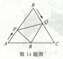 14.如图,$\bigtriangleup ABC$是边长为$6\ cm$等边三角形,动点$P$,$Q$同时从$A$,$B$出发,分别沿$AB$,$BC$方向匀速运动,其中点$P$运动的速度是$1\ cm/s$,点$Q$运动的速度是$2\ cm/s$.当点$Q$到达点$C$时,$P$,$Q$两点停止运动.在运动过程中作$QR // BA$,交$AC$于点$R$,连接$PR$,设运动的时间为$t(s)$,当$t =$