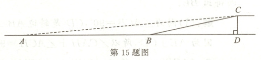 15.如图,有一段斜坡$BC$长为$10$米,坡角$\angle CBD = 12^{\circ}$,为方便残疾人的轮椅车通行,现准备把坡角降低为$5^{\circ}$.