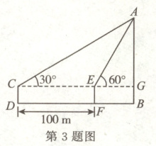 3. 如图,为了测得电视塔的高度 $AB$,在 $D$ 处用高为 $1$ 米的测角仪 $CD$,测得电视塔顶端 $A$ 的仰角为 $30^{\circ}$. 再向电视塔方向前进 $100$ 米到达 $F$ 处. 又测得电视塔顶端 $A$ 的仰角为 $60^{\circ}$,则这个电视塔的高度 $AB$(单位:米)为(