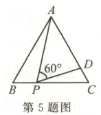 5. 如图,等边$\triangle ABC$的边长为$3$,$P$为$BC$上一点,且$BP = 1$,$D$为$AC$上一点.若$\angle APD = 60^{\circ}$,则$CD$的长为(