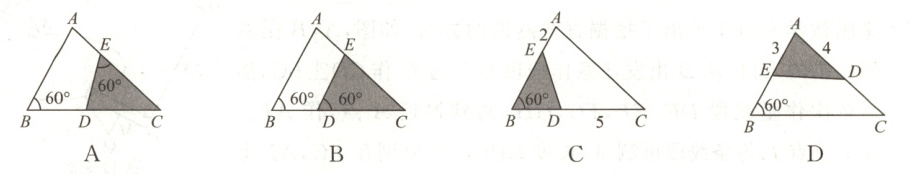 3. 如图,在$\triangle ABC$中,$\angle B = 60^{\circ}$,$AB = 6$,$BC = 8$.将$\triangle ABC$沿图中的$DE$剪开.剪下的阴影三角形与原三角形不相似的是(