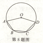 8. 如图,圆$O$通过五边形$OABCD$的四个顶点. 若$\overset{\frown}{ABD}$的度数为$150°$,$\angle A = 65°$,$\angle D = 60°$,则$\overset{\frown}{BC}$的度数为(