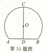 10. 如图,一圆拱桥的拱顶到水面的距离$CD$为$8 m$,水面宽$AB$为$8 m$,则拱桥的半径$OC$为(