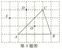 9.如图,在$5×7$网格中,各小正方形边长均为$1$,点$O$,$A$,$B$,$C$,$D$,$E$均在格点上,点$O$是$\triangle ABC$的外心,在不添加其他字母的情况下,除$\triangle ABC$外,把你认为外心也是$O$的三角形都写出来