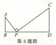 8. 如图,已知有两堵墙$AB$,$CD$,墙$AB$高$2$米,两墙之间的距离$BD$为$8$米,小明将一架木梯放在距$B$点$3$米的$P$处靠向墙$AB$时,木梯有很多露出墙外,将木梯绕点$P$旋转$90^{\circ}$靠向墙$CD$时,木梯刚好达到墙$CD$的顶端,则墙$CD$的高为