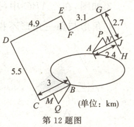 12. 希腊数学家海伦给出了挖掘直线隧道的方法:如图,$A$,$B$是两侧山脚的入口,从$B$出发任意作线段$BC$,过$C$作$CD \perp BC$,然后依次作垂线段$DE$,$EF$,$FG$,$GH$,直到接近$A$点,作$AJ \perp GH$于点$J$.每条线段可测量,长度如图所示.分别在$BC$,$AJ$上任选点$M$,$N$,作$MQ \perp BC$,$NP \perp AJ$,使得$\frac{PN}{AN} = \frac{QM}{BM} = k$,此时点$P$,$A$,$B$,$Q$共线.挖隧道时始终能看见$P$,$Q$处的标志即可.