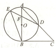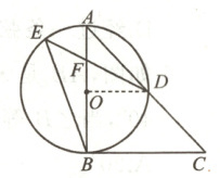 所以$DF = \sqrt{OF^2 + OD^2} = \sqrt{1^2 + 2^2} = \sqrt{5}$.因为$\overset{\frown}{BD} = \overset{\frown}{BD}$,所以$\angle E = \angle A$.