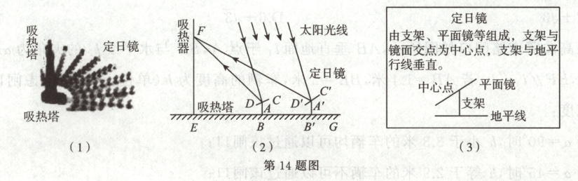 14. 图(1)是光伏发电场景,其示意图如图(2),$EF$为吸热塔,在地平线$EG$上的点$B$,$B'$处各安装定日镜[介绍见图(3)].绕各中心点($A$,$A'$)旋转镜面,使过中心点的太阳光线经镜面反射后到达吸热器点$F$处.已知$AB=A'B'=1\ m$,$EB=8\ m$,$EB'=8\sqrt{3}\ m$,在点$A$观测点$F$的仰角为$45^{\circ}$.点$F$的高度$EF$为
