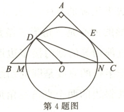 4.如图,在等腰直角三角形$ABC$中,$AB = AC = 4$,点$O$为$BC$的中点,以$O$为圆心作$\odot O$交$BC$于点$M$,$N$,$\odot O$与$AB$,$AC$相切,切点分别为$D$,$E$,则$\odot O$的半径和$\angle MND$的度数分别为(
