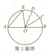 2.如图,$AB$是$\odot O$的直径,$\overset{\frown}{BC} = \overset{\frown}{CD} = \overset{\frown}{DE}$,$\angle COD = 34^{\circ}$,则$\angle AEO$的度数是(