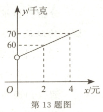 13. 某商场以每千克 20 元的价格购进某种榴梿,计划以每千克 40 元的价格销售.为了让顾客得到更大的实惠,现商场决定降价销售.已知这种榴梿的销售量$y$(千克)与每千克降价$x$(元)($0 < x < 10$)之间满足一次函数关系,其图象如图所示.