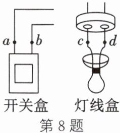 8. (2025 · 济南模拟)小明家新装修的房子,有一盏节能灯在关灯时仍能发出微弱的光,爸爸说应该是该灯开关接在零线上造成的,小明打开墙上的开关盒和天花板上的灯线盒,如图所示,用测电笔测试 $a$、$b$、$c$、$d$ 四个接线柱,下列操作和现象,能证明爸爸判断正确的是 (