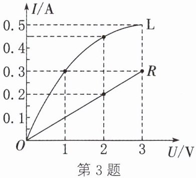 3. ($2024·$达州)现有定值电阻$R$和灯泡$L$,其电流随两端电压的变化图像如图所示。若将$R$与$L$串联在$4\ V$电源两端,则$R$与$L$消耗的电功率之比为