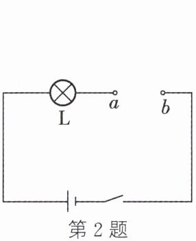 2. 在如图所示的电路中,不计温度对灯丝电阻的影响,电源电压保持不变。当在$a$、$b$间接“$6\ V\ \ 6\ W$”的灯泡$L_1$时,闭合开关,灯$L$、$L_1$均能正常发光;断开开关,在$a$、$b$间接入一个“$6\ V\ \ 12\ W$”的灯泡$L_2$后,再闭合开关,$L$的亮度变_______(亮/暗),$L_2$消耗的实际功率_______(大于/等于/小于)$12\ W$。如果只把$L_1$、$L_2$串联起来,那么它们两端允许加的最大电压为_______V。