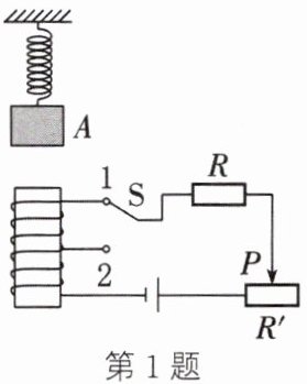 1. 如图所示,弹簧下端悬挂一铁块$A$,开关$S$由$1$拨向$2$时,弹簧的伸长量将