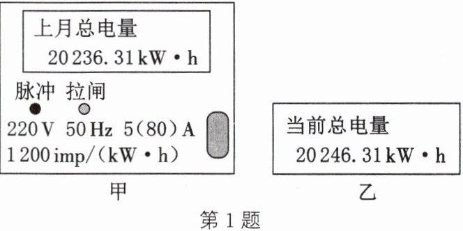 1.(教材P2材料改编)如图甲,小明家电能表显示的是截至上个月末记录的总电量,为_______,切换回当前总电量后如图乙所示,则本月小明家已用电_______度,脉冲灯闪烁_______次。