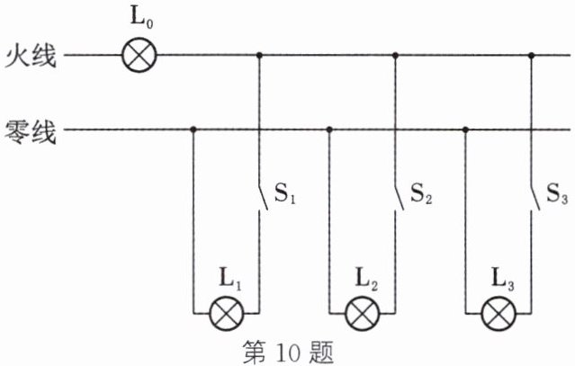 10. (2024·南通二模)如图为一条刚装好的民用照明电路,在未装保险丝之前,先将规格为“$220\ V\ 40\ W$”的白炽灯$L_{0}$接在火线要装保险丝的位置,当只闭合$S_{1}$时,$L_{0}$和$L_{1}$都呈暗红色;当只闭合$S_{2}$时,$L_{0}$不亮;当只闭合$S_{3}$时,$L_{0}$正常发光。下列判断正确的是 (
