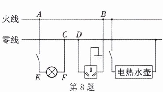 8. (2025·南通启东二模)如图所示家庭电路,闭合开关,电灯、电热水壶均正常工作,三孔插座接入电饭煲,电饭煲正常工作几秒后,$C$、$D$间出现断路,则下列说法中 (