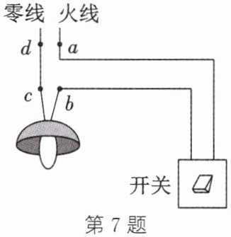 7. D [易错分析] 开关闭合后,测电笔接触零线氖管发光,不是电路短路而是零线发生断路。测电笔测试 a、b、c 三处,氖管都发光,这说明从火线到 a、b、c 处之间的电路都是完好的,没有断路;而测电笔测试 d 处时,氖管不发光,这说明 c 到 d 之间的导线出现断路。
