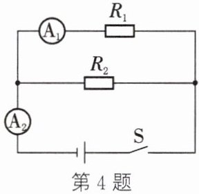 4. 在如图所示的电路中,电阻$R_2 = 20\ \Omega$。$S$闭合后,电流表$A_1$、$A_2$的示数分别为$0.2\ A$和$0.5\ A$。求: