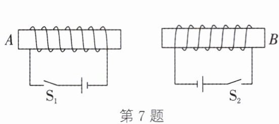 7. 如图所示,闭合开关$S_1$、$S_2$,两个通电螺线管的相互作用情况以及$A、B$端的极性分别是