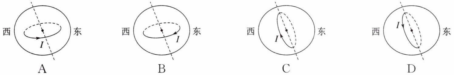 13. 为了解释地球的磁性,安培假设地球的磁场是由以地心为圆心的环形电流$I$引起的。在下列四个图中,正确表示安培假设中环形电流方向的是(图中虚线为地轴)