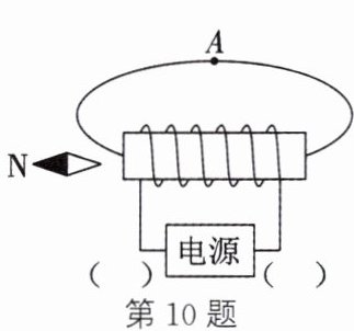 10. (2025·扬州)如图,根据小磁针静止时$N$极的指向,标出$A$处的磁感线方向和电源正、负极。