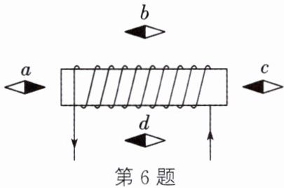 6. 如图所示,通电螺线管周围有四个静止的小磁针$a、b、c、d$,涂黑的一端表示$N$极,其中指向不正确的是