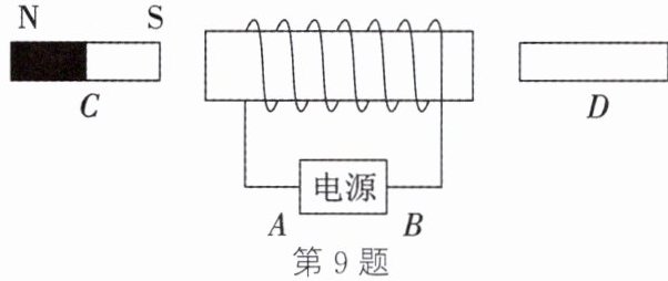 9. 如图所示,通电螺线管左侧的$C$为条形磁铁,右侧的$D$为软铁棒,$A$是电源的正极。下列判断中正确的是